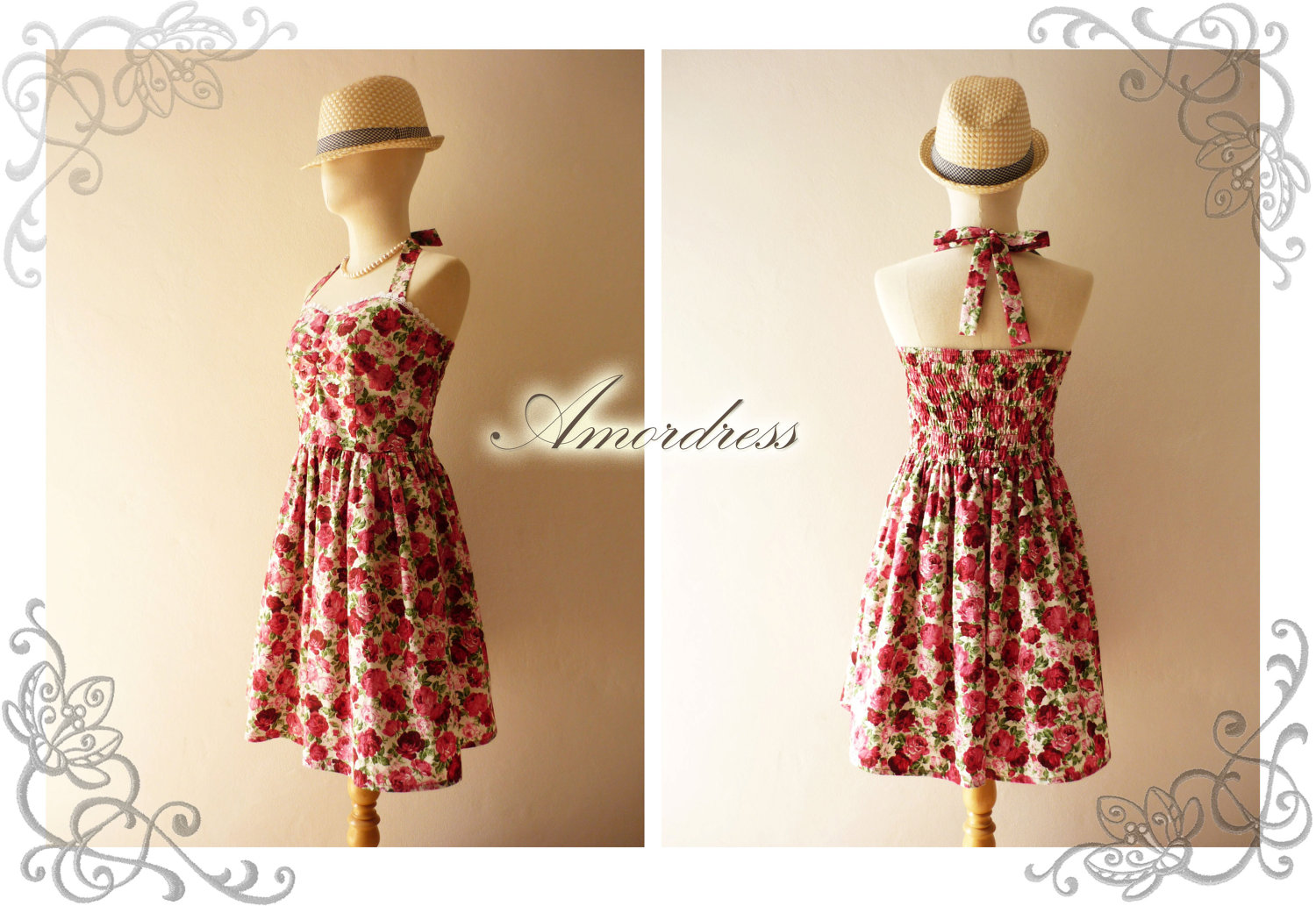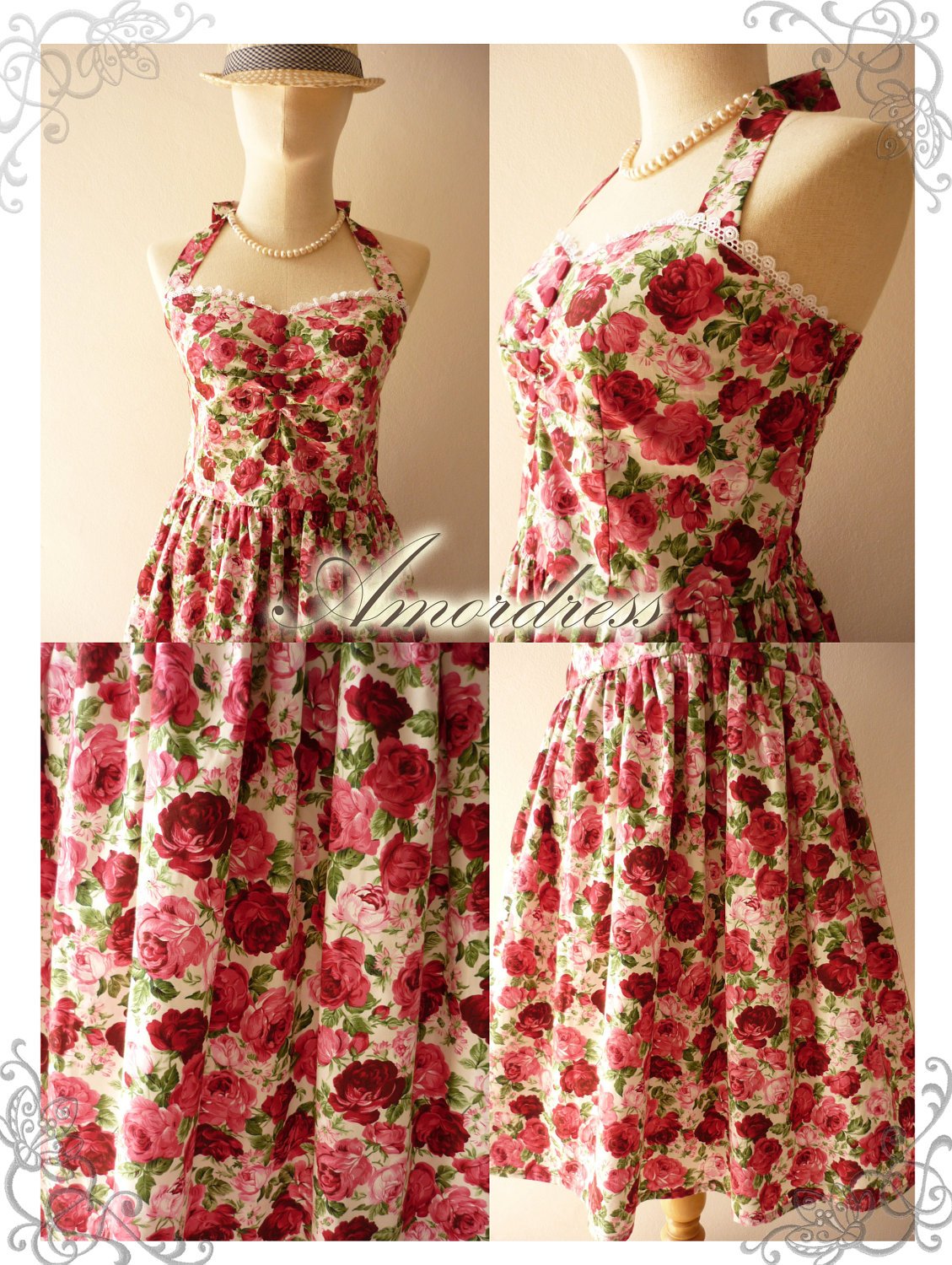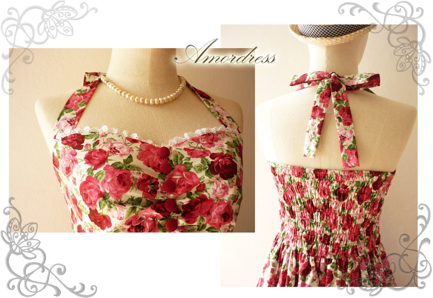 Floral Dress Rose Dress Party Vintage Inspired Halter Neck Cerise Pink Red Rose Little White Lace Dress -Size XS, S, M, L, XL-