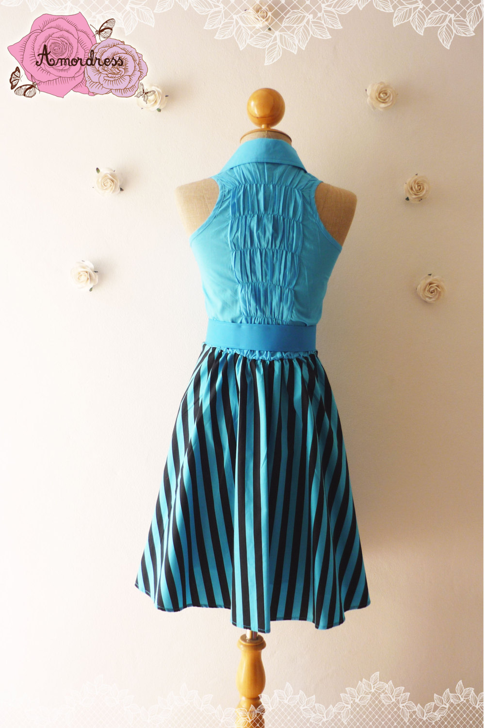 Summer Dress Blue Shirt Dress Black Blue Retro Stripe Dress Vintage Inspired Dress Party Dress Cotton Dress - Size XS-S
