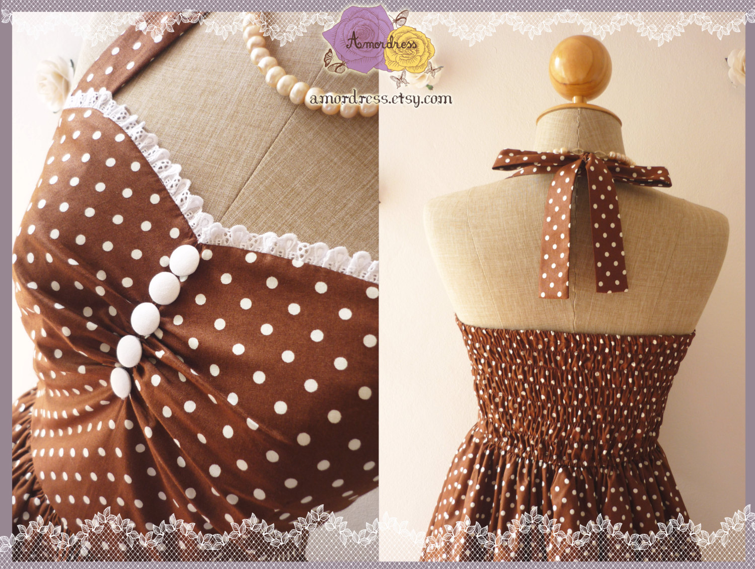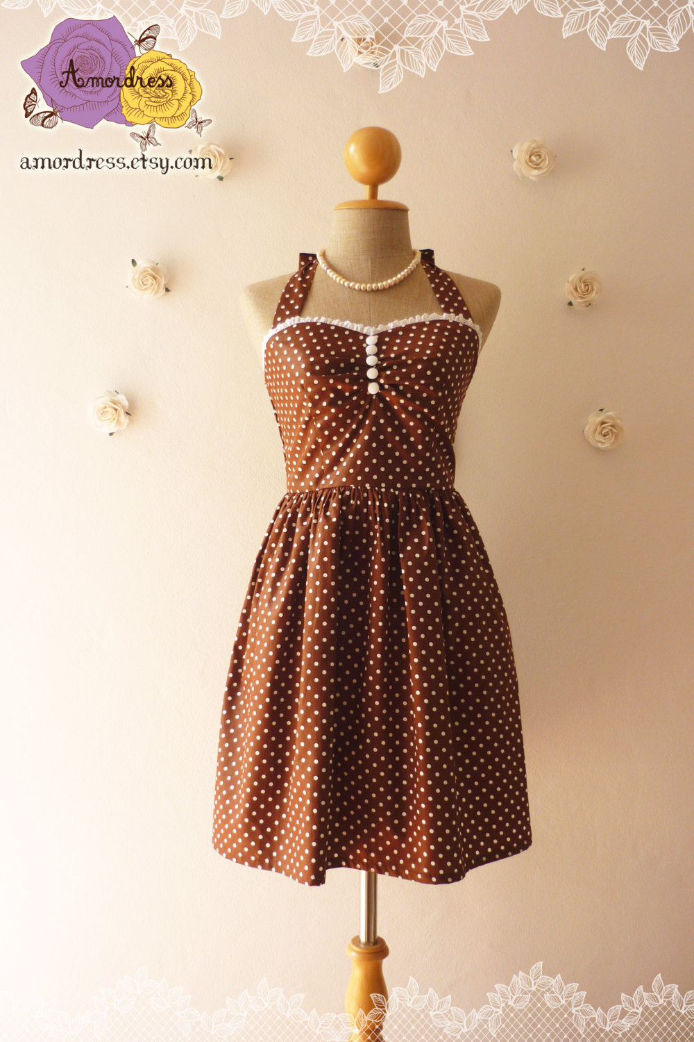 Brown Bridesmaid Dress Brown Dress Summer Dress Tea Length Dress Polka Dot Dress Party Dress Once Upon A Time -Size XS, S, M, L,XL CUSTOM-